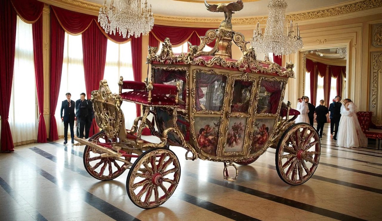 Royal Gold Carriage – Baroque Style Horse-Drawn Coach with Painted Panels & Velvet Interior