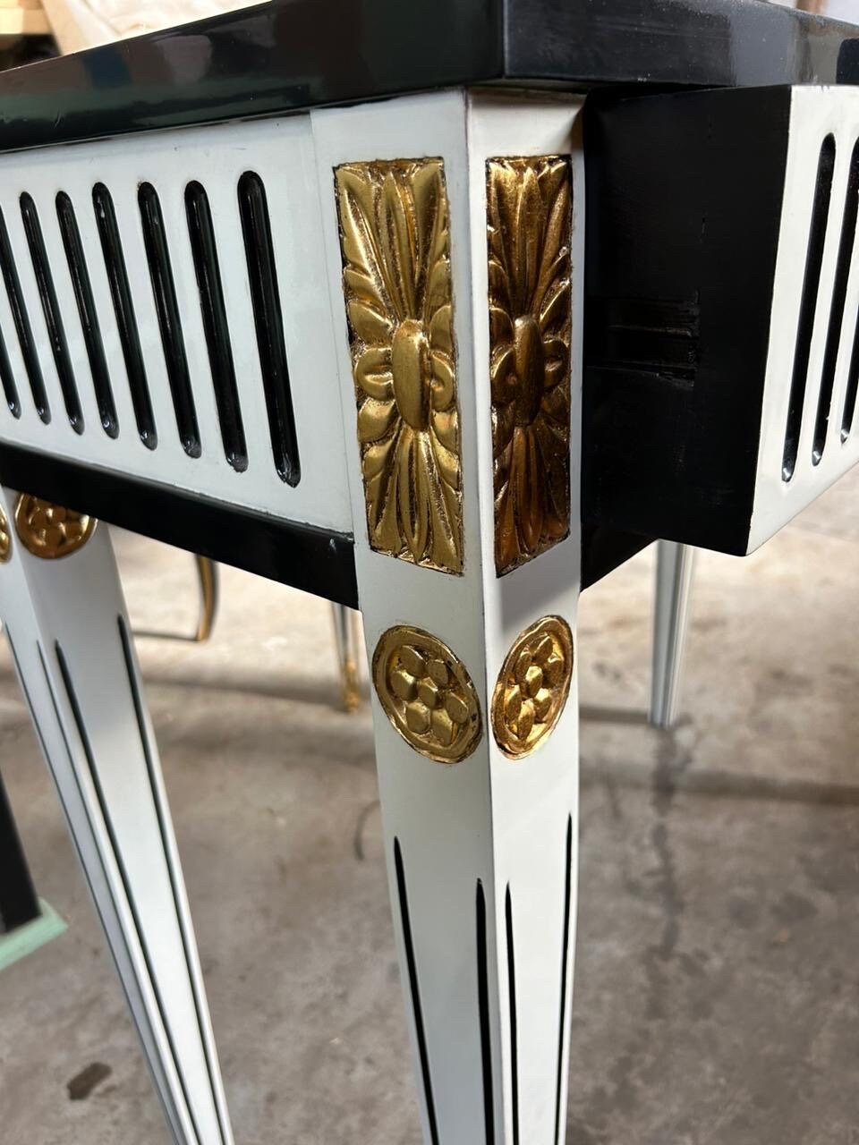 Standout style Courtly Stripes, rich with texture and infused with color, as only our artisans can do. The beautifully proportioned Courtly Stripe Console Table features a graceful scalloped-edge apron, corner blocks studded with gold beads, and carved legs that offer our artisans a chance to play with solids, stripes, and dots.