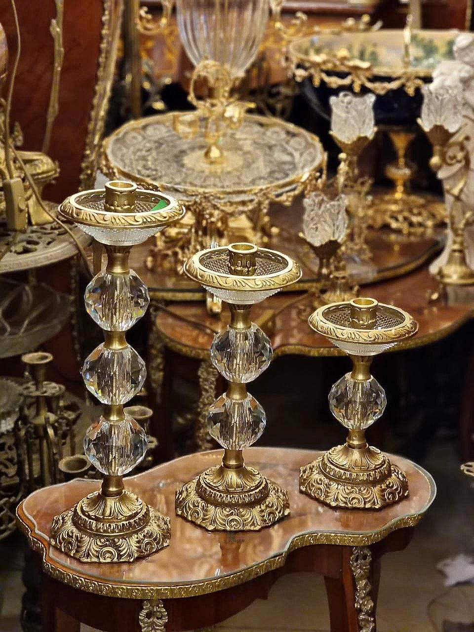 Elevate your interior with this luxurious set of three vintage-style candle holders, expertly designed in a French Rococo or Louis XVI-inspired aesthetic. Each piece features gilded bronze bases and tops, with faceted crystal orb stems that reflect light beautifully, adding glamour and sophistication to any room.